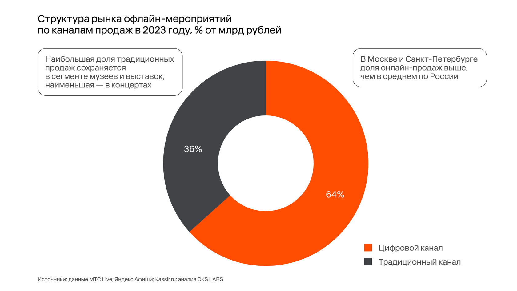 Почти две трети (64%) продаж билетов в денежном выражении приходится на онлайн-каналы — витрины билетных операторов и сайты организаторов. У этого есть несколько причин: