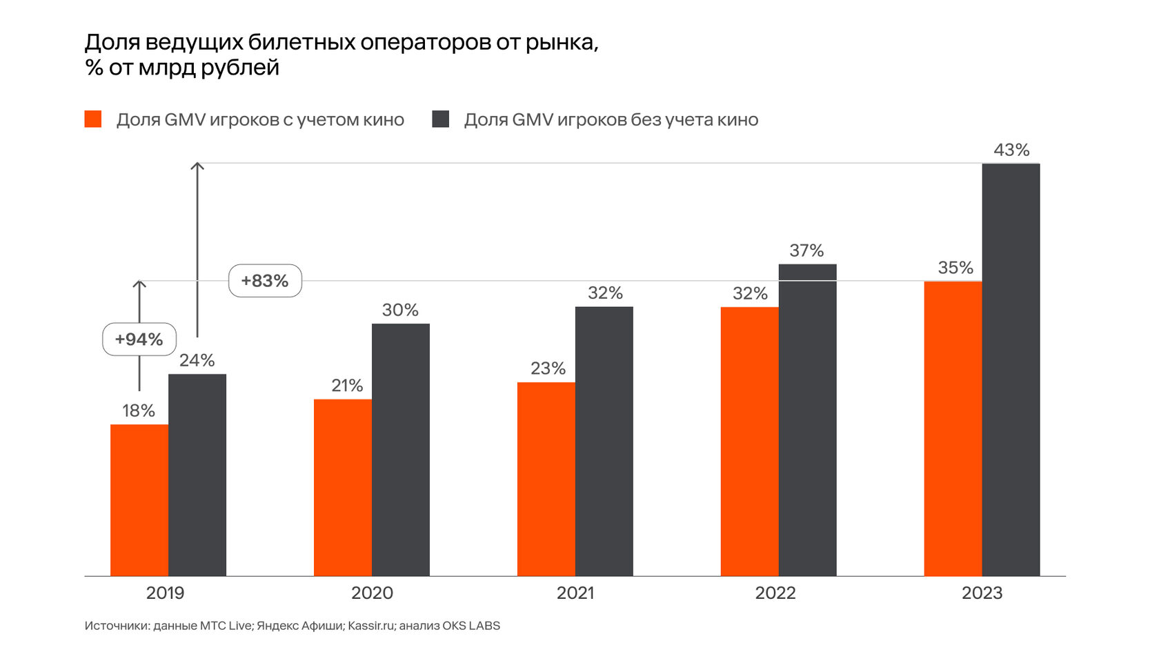 Интернет-платформы играют все более важную роль в реализации билетов. За пять лет совокупная доля крупнейших агрегаторов — Яндекс Афиши, МТС Live и Kassir.ru — выросла в два раза, с 18% до 35% (доля GMV трех игроков с учетом кино). При этом аналогичная доля без учета кино достигла 43% в 2023 году. Бизнес развивается за счет поглощения билетных систем и более мелких операторов; консолидации организаторов мероприятия, которые получают доступ к широкой аудитории при размещении на витринах операторов; запуска собственных мероприятий и строительства площадок. Кроме того, билетные операторы привлекают удобством: в одном месте покупатель получает богатый выбор и кешбэк от экосистем.