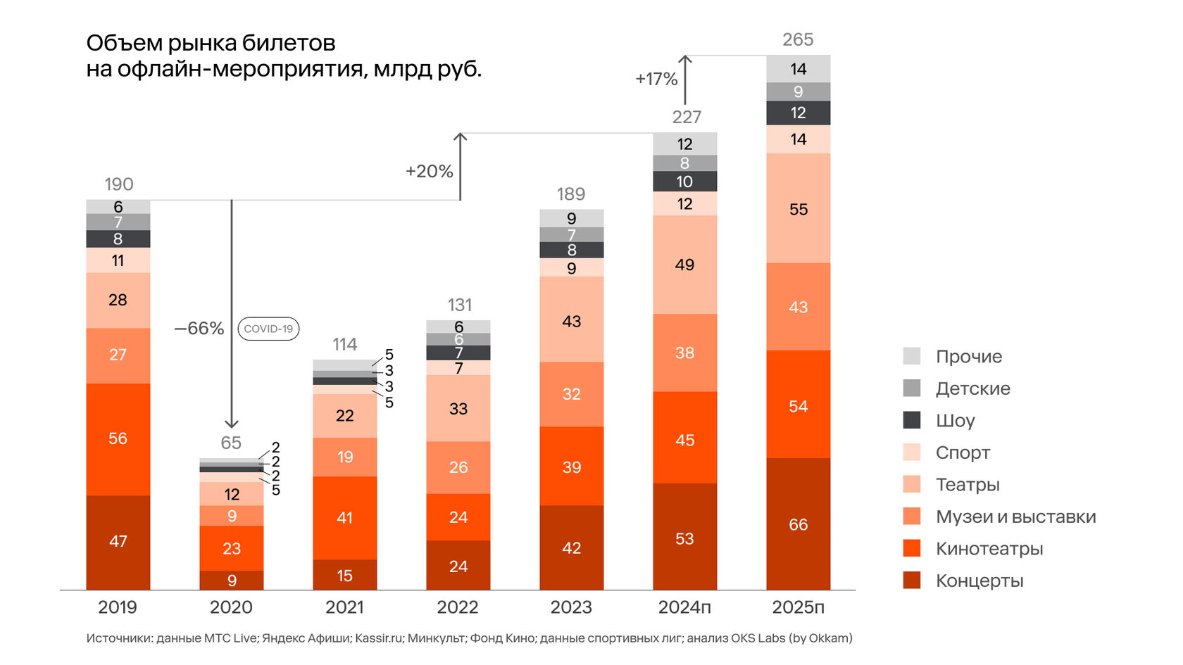 Консалтинговая компания OKS Labs совместно с крупнейшими билетными операторами — Яндекс Афишей, Kassir.ru и МТС Live — изучила российский рынок офлайн-развлечений. Отправной точкой исследования стал 2019 год, когда индустрия развлекательных мероприятий достигла расцвета. Первый удар по рынку нанесла пандемия: в 2020 году на фоне ковидных ограничений продажи билетов на офлайн-мероприятия сократились почти в 3 раза, со 190 до 65 млрд рублей. По мере снятия ограничений рынок начал восстанавливаться, однако в 2022 году столкнулся с новыми вызовами. Из-за санкций бизнес лишился значительной части зарубежных поставщиков контента: в первую очередь пострадали сегменты концертов, кинотеатров и спортивных мероприятий.