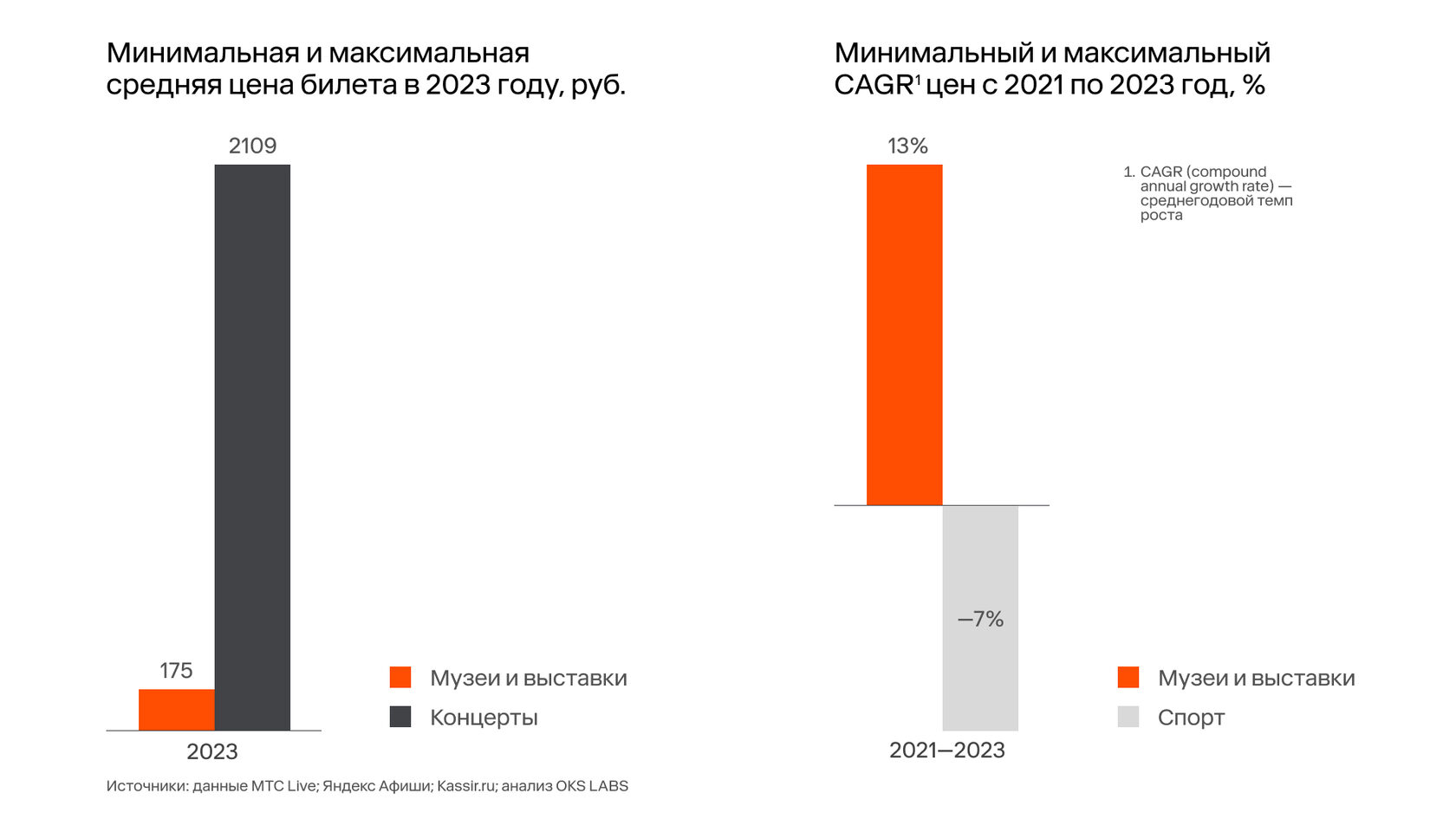 Самым бюджетным вариантом остаются выставки и музеи, поскольку большинство музеев — государственные учреждения с финансированием из бюджета. Однако увеличение издержек и возросший спрос со стороны посетителей влияют и на этот сегмент: в 2021–2023 годах билет на выставку подорожал в среднем на 13%.
